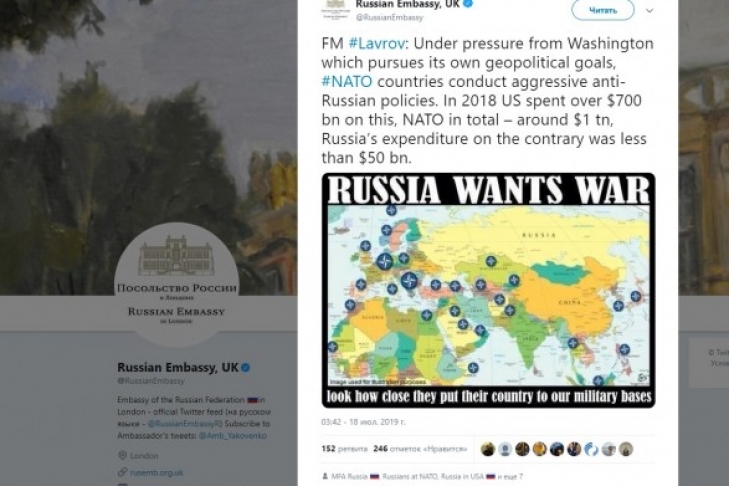 Соответствующей картой посольство проиллюстрировало цитату министра иностранных дел РФ Сергея Лаврова, критикующего политику США и НАТО в отношении России.