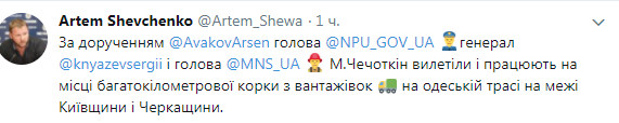 "По поручению Арсена Авакова глава Нацполиции генерал Князев и председатель ГСЧС Чечеткин вылетели и работают на месте многокилометровой пробки из грузовиков на одесской трассе на границе Киевщины и Черкасщины", - написал он.