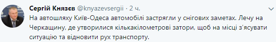 "На автодороге Киев-Одесса автомобили застряли в снежных сугробах. Лечу в Черкасскую, где образовались километровые пробки, чтобы на месте выяснить ситуацию и восстановить движение транспорта", - написал он.