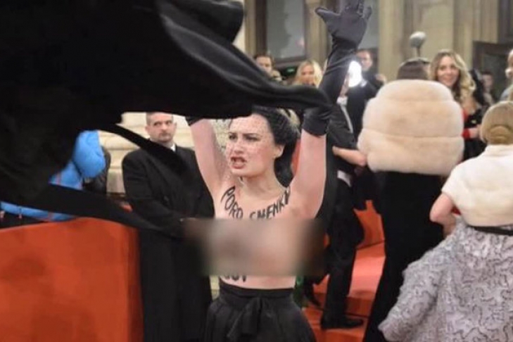 Девушка продемонстрировала обнаженную грудь с надписью, где содержался призыв к президенту Украины убраться с бала.