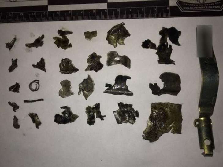Следователи изъяли осколки и рычаг к запалу ручной гранаты с маркировкой.