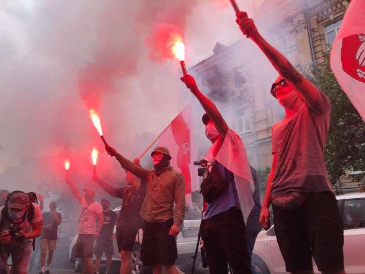 Так, под дипломатическим учреждением собралось около 40 человек, требующих "вернуть честные выборы в Беларуси". Через час после начала акции около пяти активистов зажгли файеры и выкрикивали лозунги "Живе Білорусь".