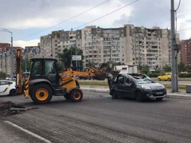 В Киеве на ул. Анны Ахматовой во время ремонта асфальтового покрытия тракторист ковшом разбил крышу автомобиля.