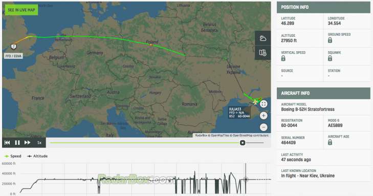 Согласно данным, бомбардировщики B-52 Stratofortress с позывными JULIA51 и JULIA53 вылетели с британской базы Royal Air Force Fairford около 5 часов назад. Они залетели на территорию Украины из Польши, пролетели в направлении Крыма и начали кружить между Мелитополем и Геническом.