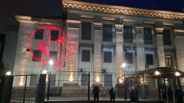 А на стену посольства участники акции с помощью лазерной установки спроектировали карикатурный профиль Путина и надпись "Россия превратилась в террористическую организацию".