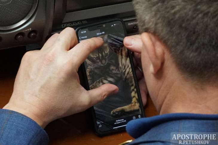 В Верховной Раде фотокорреспонденту Апострофа удалось поймать в объектив, как депутат от ОПЗЖ Владимир Мороз увлеченно рассматривал изображения кошек в телефоне между голосованиями.