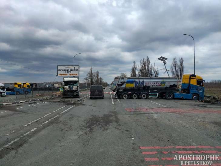 Еще несколько дней назад на дороге лежали тела убитых мирных жителей, которые бежали от русских оккупантов. Сегодня же об ужасах "русского мира" напоминают расстрелянные автомобили, а также символика российских агрессоров - буква "V". Она была нанесена на импровизированные блокпосты оккупантов, которые были сделаны из расстрелянных гражданских автомобилей.