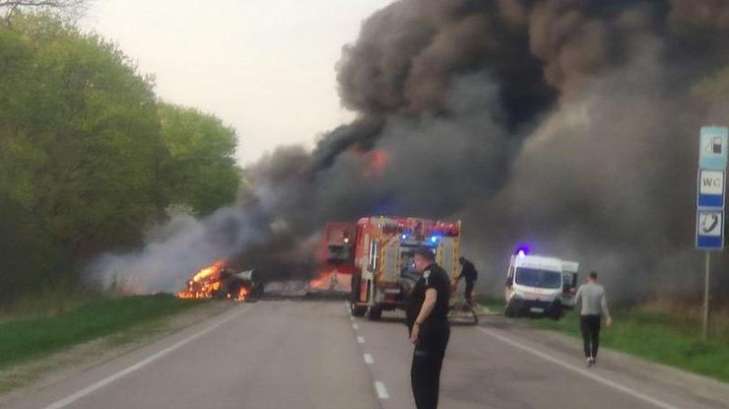 Внаслідок зіткнення пасажирського автобуса з бензовозом сталося загорання. О 20:13 пожежу локалізовано, о 20:35 - ліквідовано, повідомили в МВС України.