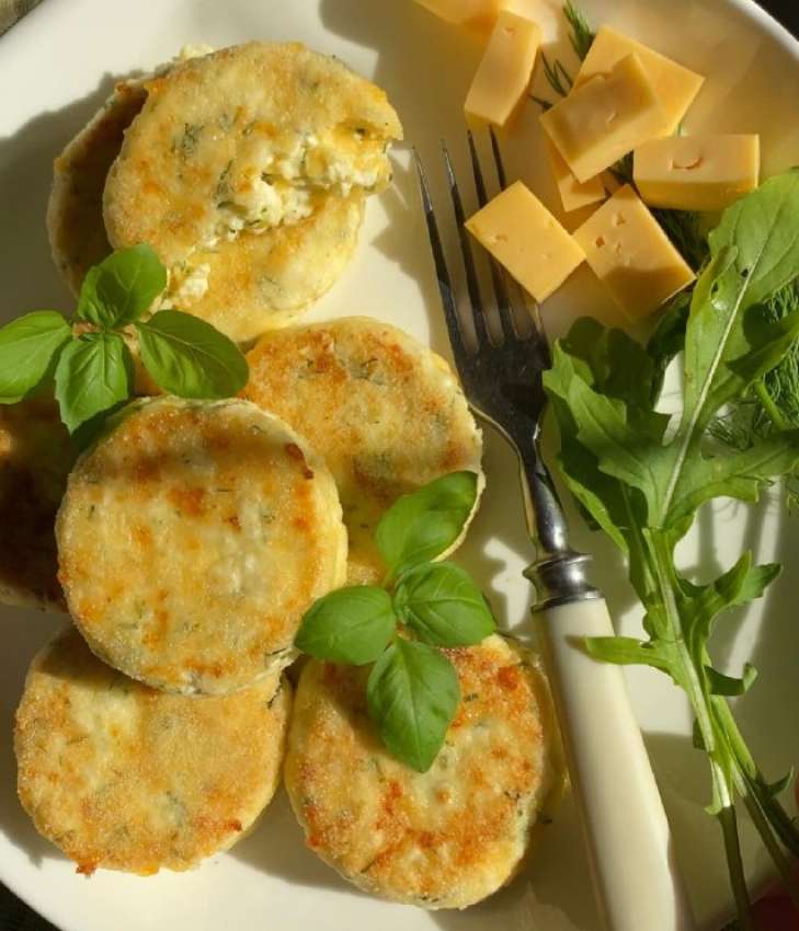 Прилагается рецепт соленых сырников: кисломолочный сыр (220 г), твердый сыр (100 г), яйцо (1 шт.), мука (2-2,5 ст. л.), зелень (укроп), соль, манка (1 ст. л.).