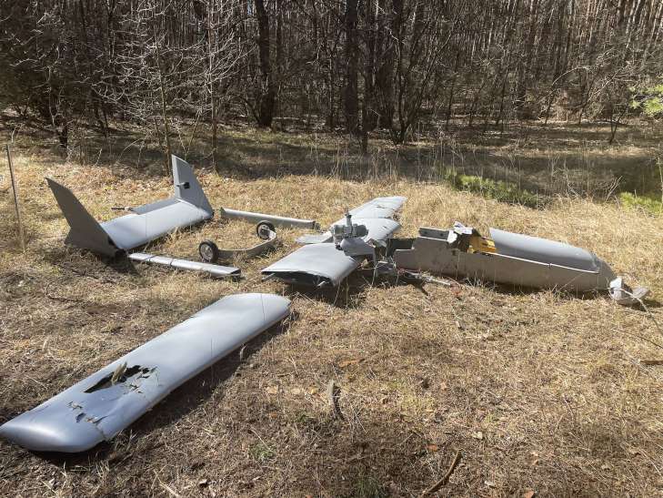 Бійці 111-ї бригади Сил територіальної оборони показали журналістам місце падіння ворожого БпЛА та його уламки. Він ніс на собі бомбу вагою майже 20 кг.