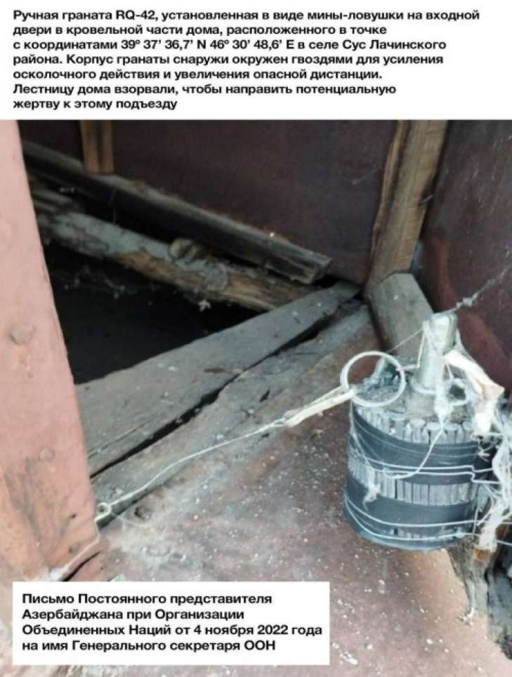 У листі голови Азербайджану Джейхуна Байрамова на ім'я Генсека ООН йдеться про продовження у Вірменії формування нових бойових позицій на території Азербайджану, де тимчасово розміщено контингент російської федерації, а також проведення інженерно-фортифікаційних робіт і в цьому контексті встановлення великої кількості мін. Присутність цього контингенту суттєво обмежила роботи з розмінування.