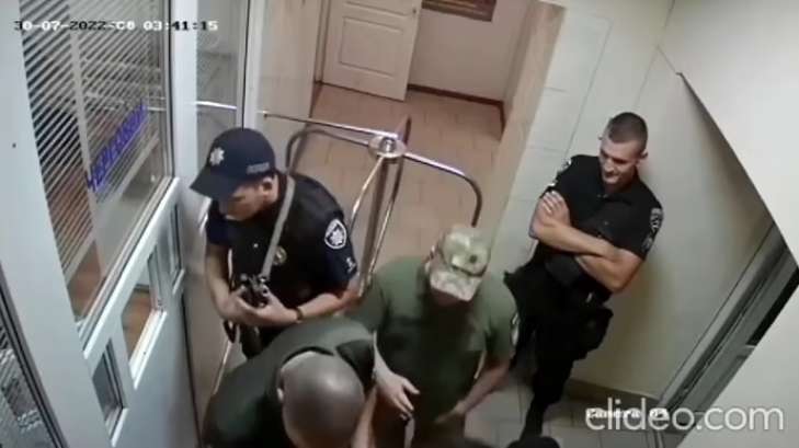 Після побиття черговий дає затриманому документи для підпису. Чоловік намагається щось пояснити, але до нього підходить військовий та починає бити. “Додаткових” стусанів йому надавав цивільний. Поліція просто спостерігає, військові посміхаються.