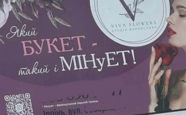 «Місцева студія флористики Viva Flowers розмітила борд зі слоганом „Який БУКЕТ, такий і МІНуЕТ“, що викликало чергове жваве обговорення серед містян через споріднення слів, які можуть трактуватися, як танець і як різновид статевого акту, оральний секс. На площині дійсно є приписка, що „Мінует — французький парний танець“, хоча насправді цей танець має назву menuet і транслюється, як мЕнует», — йдеться у повідомленні.