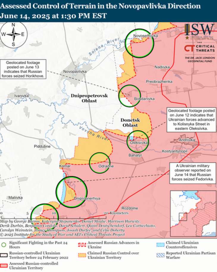 Американські дослідники війни також констатують, що загарбники активізували наступальні операції на південний захід від Покровська між Солоним та Богданівкою у напрямку Дніпропетровської області у березні та квітні 2025 року та нещодавно просунулися до адміністративного кордону за сім кілометрів на схід від Новопавлівки.