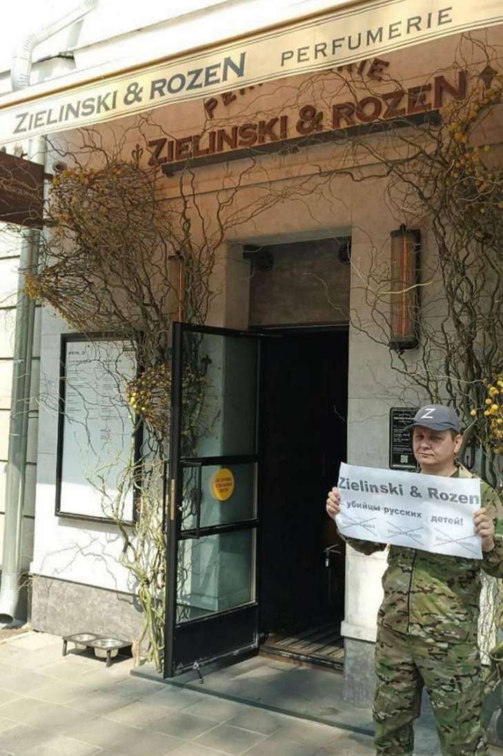 Російська компанія Zelienski & Rozen, що належить ймовірному контрабандисту-втікачеві з нібито російським паспортом Сєяру Куршутову та його дружині, громадянці Білорусі Катерині Любчик, офіційно заявила про підтримку України й відправила на фронт мило та парфуми свого бренду. У рашці з цього добряче пригоріло — обурені «патріоти», повідомляє "Фраза", схоже, влаштували протести під магазином Zelienski & Rozen, звинувачуючи в тому, що вони «убівают русскіх дєтєй» (див. фото).