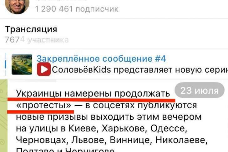 Пропагандист Володимир Соловйов регулярно публікує у своєму Телеграм каналі дописи про акції, очікуючи, що українці скинуть «корумпований режим».