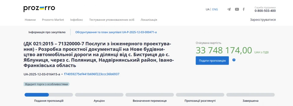 Попри публічний розголос, критику і звільнення чиновників, тендер на проєктування нової дороги в напрямку Буковеля досі не скасований і залишається активним, як стало відомо з системи Prozorro.