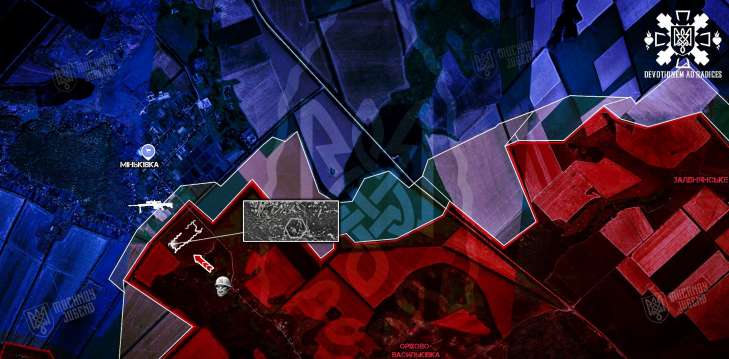 Паралельно з цим, за візуальним контролем, ворог продавив ще один рубіж - забрав опорник перед Міньківкою. Це вже підготовлена точка опори, з якої зручно розгортати наступ далі по ланцюгу.