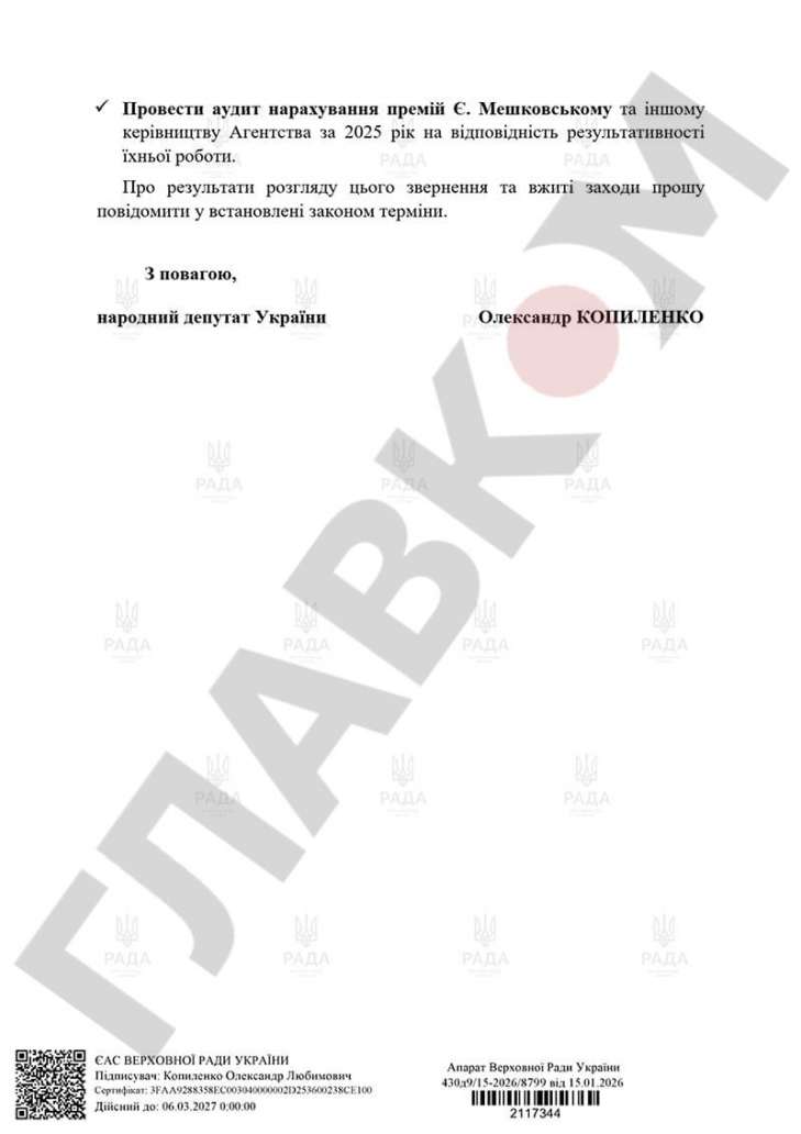 Окремо нардеп Копиленко просить ДБР дослідити космічні премії, які, за його даними, отримує посадовець Агентства відновлення Мешковський: при окладі 105 тис. грн йому нараховуються квартальні премії у розмірі 300% (три оклади замість дозволеного одного).