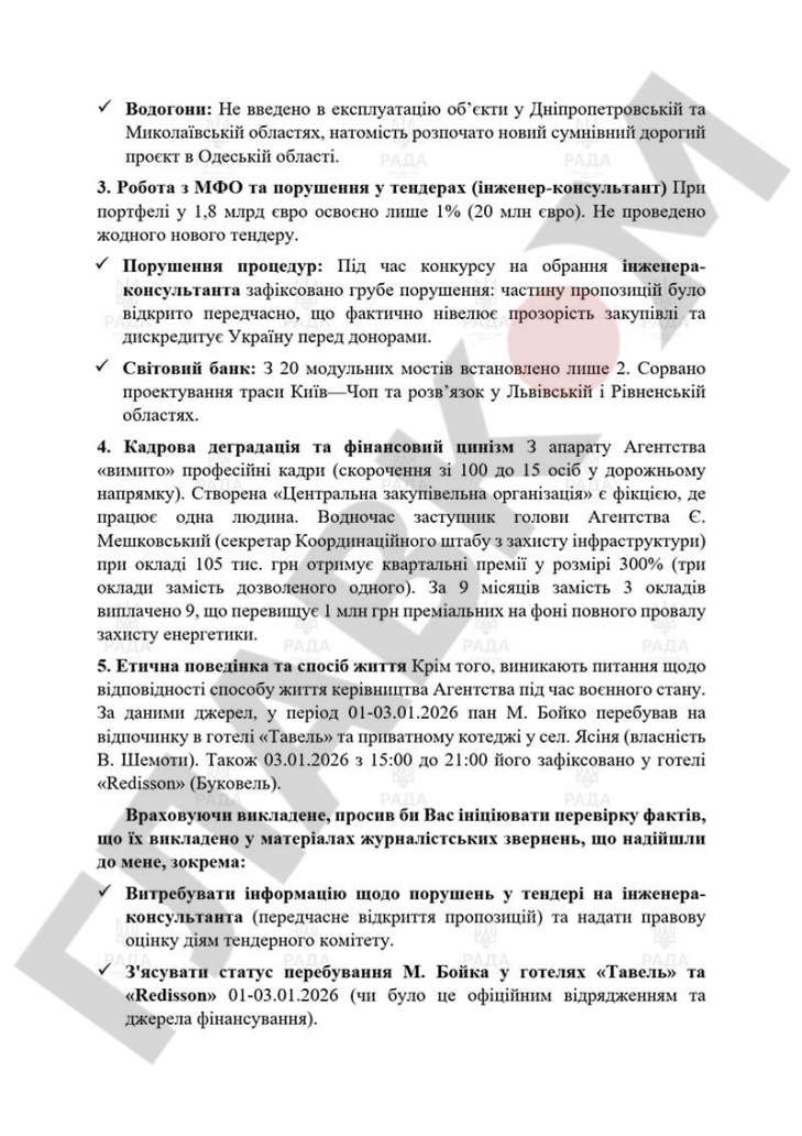 Зі змісту заяви нардепа, яка потрапила у розпорядження «Главкома» випливає: протягом 1-3 січня 2026 року перший заступник голови Агентства відновлення Микола Бойко (це відомство мало б забезпечувати будівництво захисту енергоінфраструктури) перебував на відпочинку в готелі «Тавель» та приватному котеджі у селі Ясіня на Закарпатті. Також посадовця 3 січня було зафіксовано у готелі Redisson (Буковель).