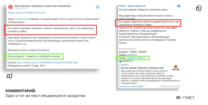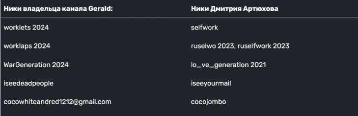 Ну и дополнительно хотим отметить, что Дмитрий Артюхов — глубоко паттернизированный человек. Это можно отследить, сравнивая псевдонимы в сети самого Артюхова, которые он использовал в разное время, и создателя канала “Платежный Щит” Геральда, например, во время набора людей в команду тг-канала на darknet-форумах. Приглашаем сравнить: