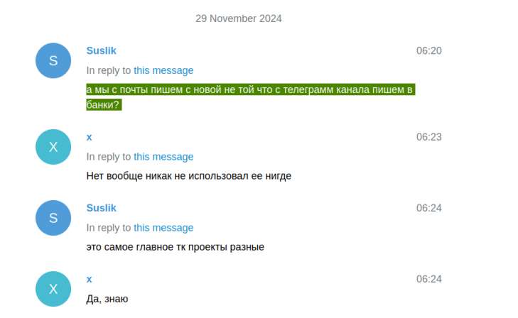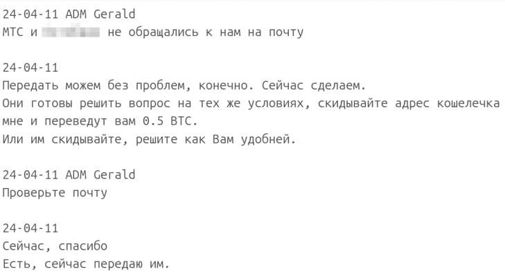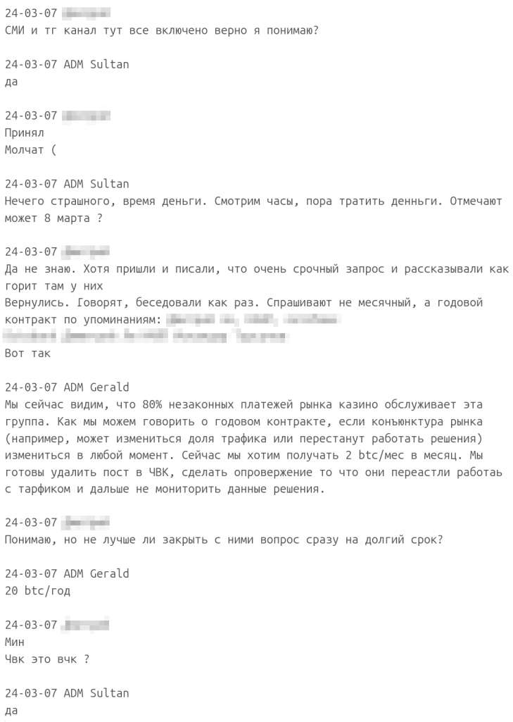 После установления личности одного из администраторов, мы вышли с ним на контакт, и он согласился сотрудничать и предоставлять всю внутреннюю информацию из рабочих чатов менеджмента проекта “Платежный Щит”. Благодаря этому получилось установить аккаунты ключевых лиц, которые являлись владельцами и администраторами проекта, а также их преступные цели и планы.