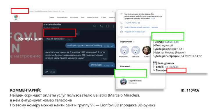 Анализ тем, которые открывал пользователь Bellatrix на форуме, позволил выявить номер телефона +79**460**26. На него Bellatrix получал оплату за свои услуги, пишет польская пресса со ссылкой на OSINT-расследователей. Номер привел к организации Lionfovi, которая в 2019 году занималась продажей 3D-ручек. Администратором группы VK, посвященной этому проекту, был Фантом. К его странице https://vk.com/fatum_adm и был привязан упомянутый номер телефона.