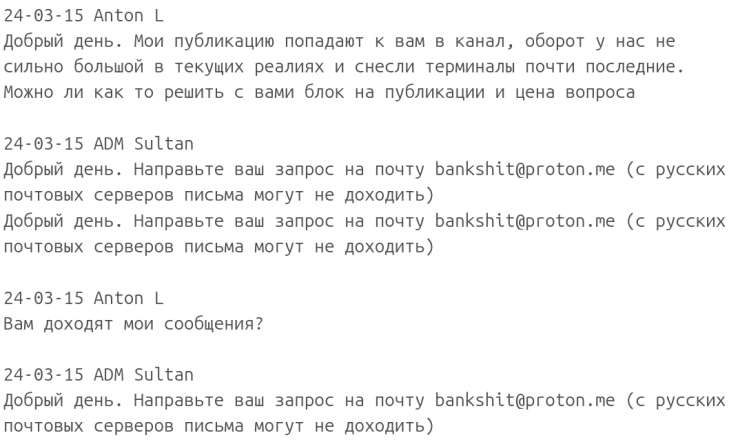 Что значит “мои публикацию к вам в канал”? В марте 2024 года публичная деятельность «Платежного щита» была минимальной. Как видно, на сообщение приходит автоматический ответ от администратора с ником Sultan, который просит общаться на почту сервиса Protonmail. Сообщения от Антона выглядят как тестирование работы того самого автоматического ответа, проверяя будут ли дублироваться ему сообщения, после чего автоматический ответ в боте Щита отключили. Так ли это на самом деле, или у вас есть другие предположения?