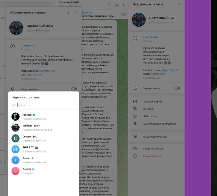 На скриншоте выше виден состав администраторов канала “Платежный Щит”. Владельцем проекта является пользователь, скрывающийся под тг-аккаунтом с именем “Gerald”. Помимо установленного администратора выявлен аккаунт с именем “Sultan”, который также является ключевым в проекте.