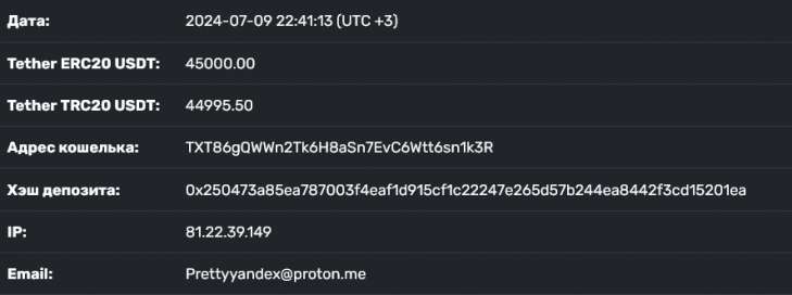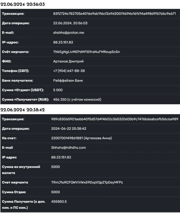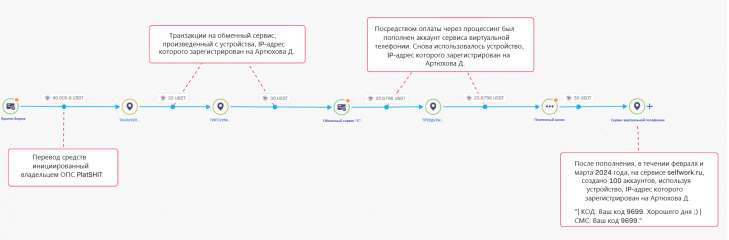 Установлено, что криптовалютный адрес TAUKxY8RCPmhqGNn3W1VmmoPcyTRvNj9Pk, предположительно использовавшийся Артюховым Дмитрием Александровичем, в 2024 применялся для получения активов от деятельности ОПС Platshit и обналичивания значительных средств в безналичные фиатные денежные средства: