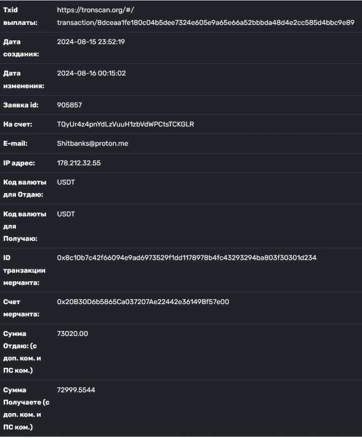 24.07.2024 в 01:32 был инициирован вывод 40 012 USDT (ERC20) с последующим обменом на 40 000.79 USDT (TRC20), переведенных на адрес TAUKxY8RCPmhqGNn3W1VmmoPcyTRvNj9Pk.