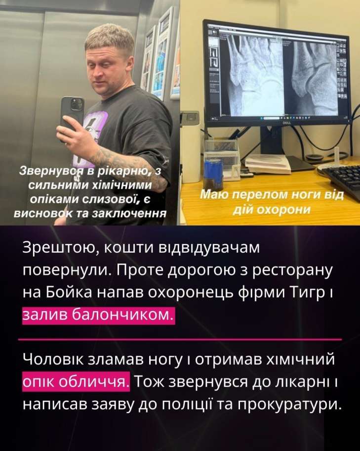 Згодом кошти відвідувачам повернули. Однак, за словами підприємця, дорогою з ресторану на нього напав працівник охоронної фірми та застосував перцевий балончик.