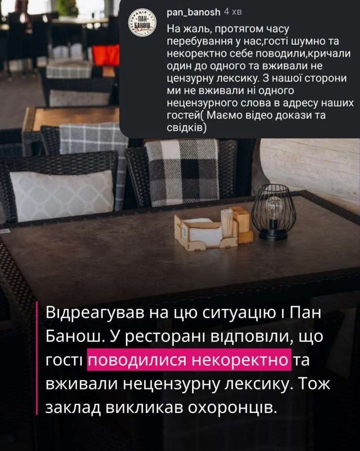 Свою позицію оприлюднив і ресторан "Пан Банош". У закладі стверджують, що відвідувачі поводилися некоректно та вживали нецензурну лексику.
