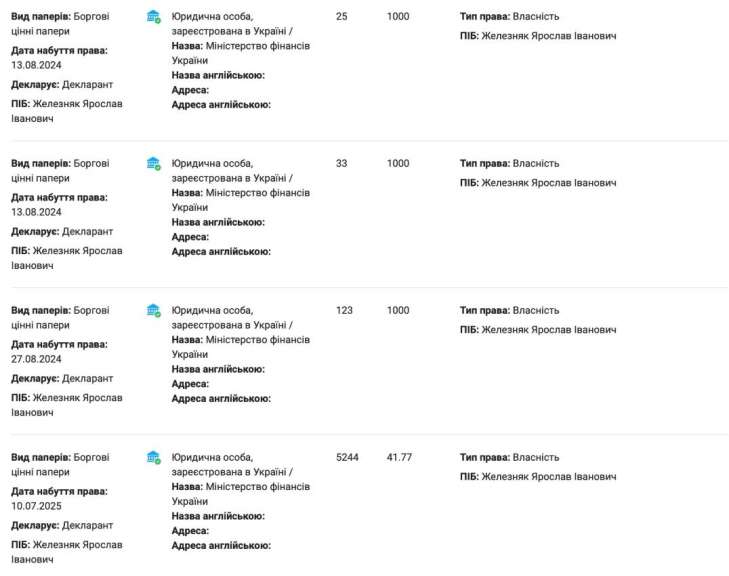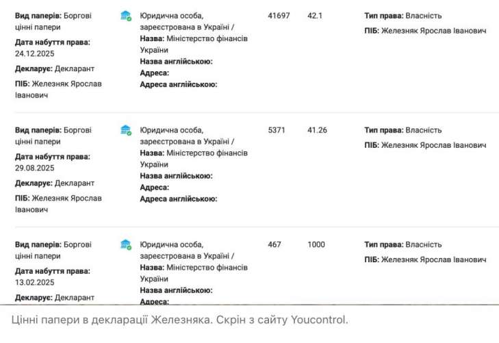 У нардепа Ярослава Железняка журналісти знайшли щонайменше 1,3 млн грн, які той не за декларував. Саме таку суму становить різниця доходами Ярослава Железняка та його витратами на купівлю облігацій Мінфіна на 3,6 млн грн згідно з декларацією за 2025 рік. Про це йдеться у журналістському розслідуванні видання «Інформатор», яке надіслало запит до НАЗК.