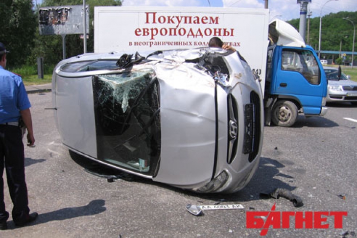 В результате произошло столкновение, от которого автомобиль Hundai бросило в правый ряд, где он врезался в стоящий на обочине МАЗ и перевернулся.