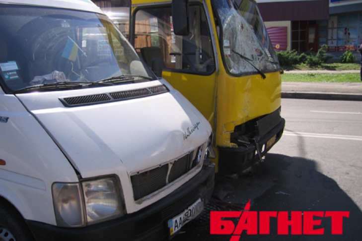 В Киеве на ул. Мишуги в направлении просп. Григоренко (напротив ТРЦ «Пирамида») 25 июня маршрутка «Богдан» столкнулась с двумя легковыми автомобилями.