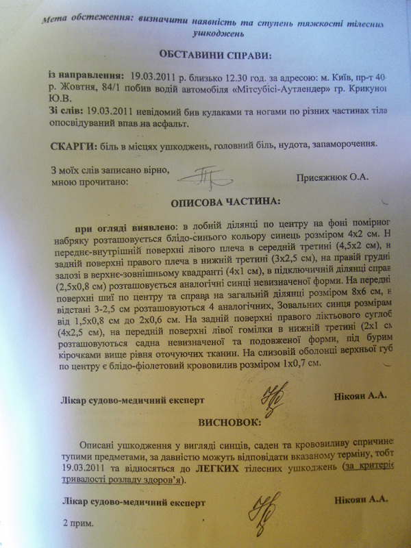 Водитель «Газели» О. Присяжнюк, получив в милиции направление, прошел судебно-медицинскую экспертизу. Эксперт насчитал на теле и лице водителя полтора десятка различных гематом: дело в том, что когда нынешний кандидат в депутаты Ю.Крикунов его избивал, супруга экс-чиновника хватала водителя за руки, не давая сопротивляться.