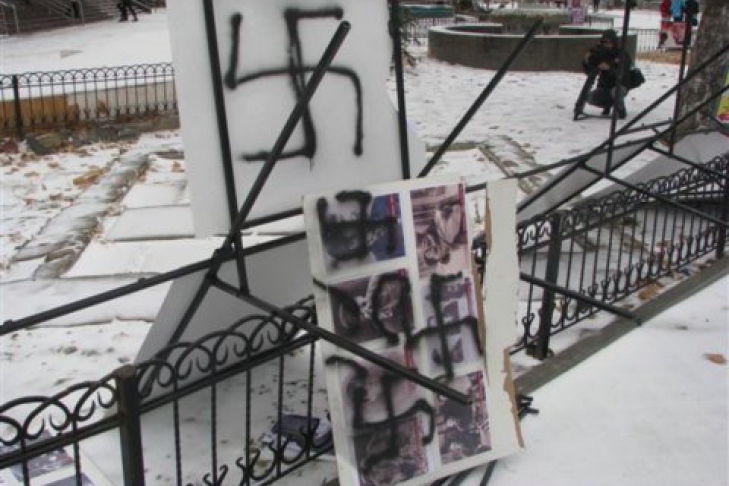 Организаторы отказались это сделать, и активисты Меджлиса перевернули стенды с цитатами и изображениями Сталина, а потом нарисовали краской на снесенных стендах свастику. «Для нас Сталин и Гитлер одинаковые!», - сказали представители Меджлиса.