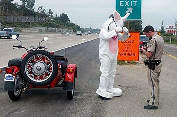 Байкер, одетый в костюм Пасхального Кролика, был остановлен полицией за отсутствие шлема. Полицейский Адам Гриффитс остановил необычно одетого байкера в Сан Диего (Калифорния), в день Пасхи, 31 марта.