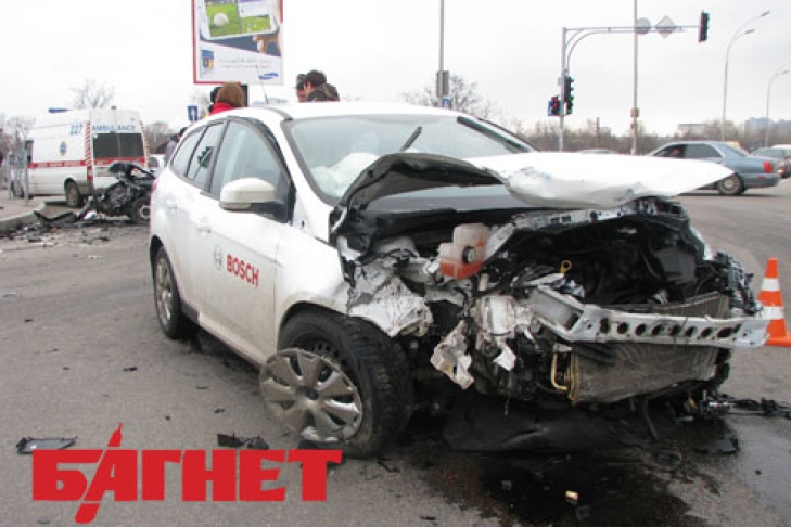 В субботу, 6 апреля, в Киеве на перекрестке проспекта Григоренко и улицы Здолбуновской «влобовую» столкнулись Ford Focus и Volkswagen Passat.