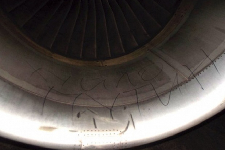 Черным маркером на корпус и двигатели авиалайнера нанесли известную кричалку футбольных фанатов "Путин - х*ло", сообщает УНИАН