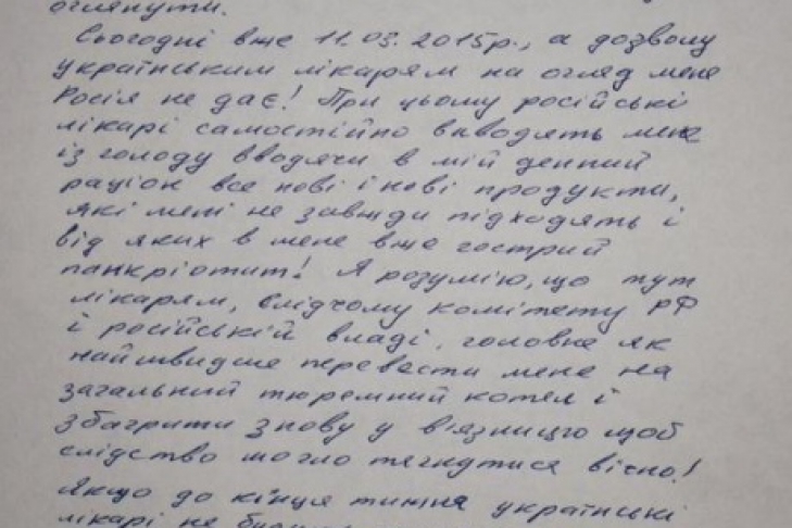 "Сегодня уже 11 марта, а разрешения украинским врачам на осмотр меня Россия не дает, при этом российские врачи самостоятельно выводят меня из голода, вводя в мой рацион все новые и новые продукты, которые мне не всегда подходят и от которых у меня уже острый панкреатит", - написала Савченко.