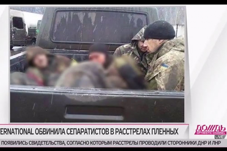 Журналист Тимур Олевский узнал о расстрелах украинских военнопленных. Кроме эпизода на "параде пленных" он обратил внимание на запись боевиков, на которой показан грузовик с украинцами, который захватили пророссийские силы. На нем видно как превосходящие по количеству боевики убивают раненого украинского бойца. Это при том, что один из террористов выступает против убийства, но другой его не слушает, после чего слышны выстрелы.