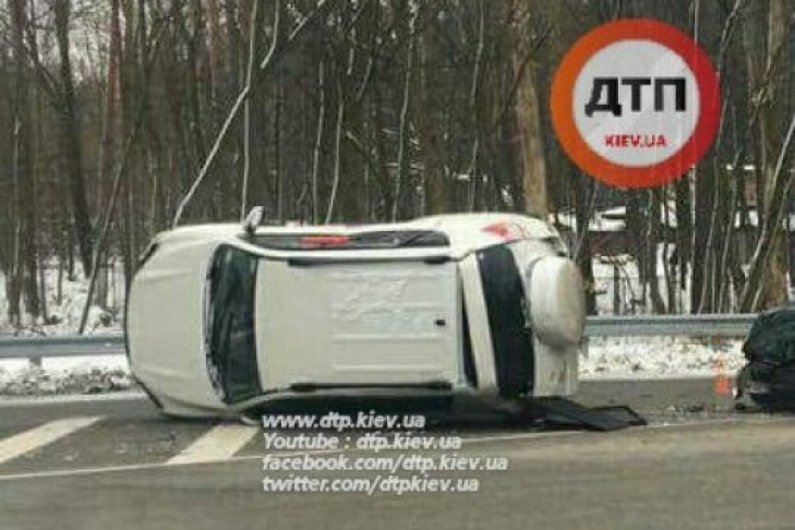 Там водитель "Деу Нексия", двигаясь в сторону Киева, врезался в правый бок белого кроссовера, который осуществлял разворот. В результате удара белый автомобиль опрокинулся на левый бок.