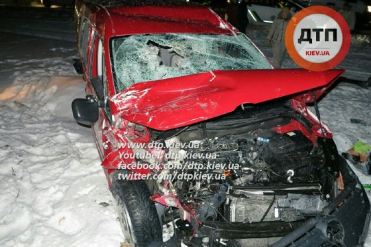 Там, в 3 км от КП, водитель автомобиля "Фольксваген", двигаясь из Киева, допустил касательные столкновения с попутными микроавтобусом и грузовиком "Мерседес", после чего вылетел на встречную полосу и врезался в едущий в сторону Киева "Форд". После удара "аиериканец" вылетел в кювет и зацепил два дерева.