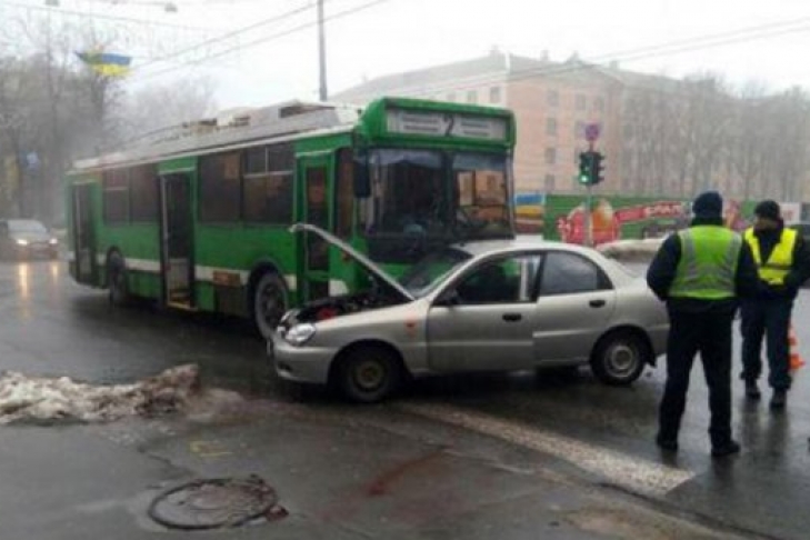 В Харькове троллейбус поехал на красный свет светофора и в результате столкнулся с Daewoo Lanos.