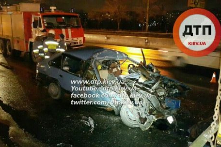 Там водитель "Москвича", двигаясь со стороны Петровки в сторону Троещины, не справился с управлением и на большой скорости въехал в стоячий КрАЗ.
