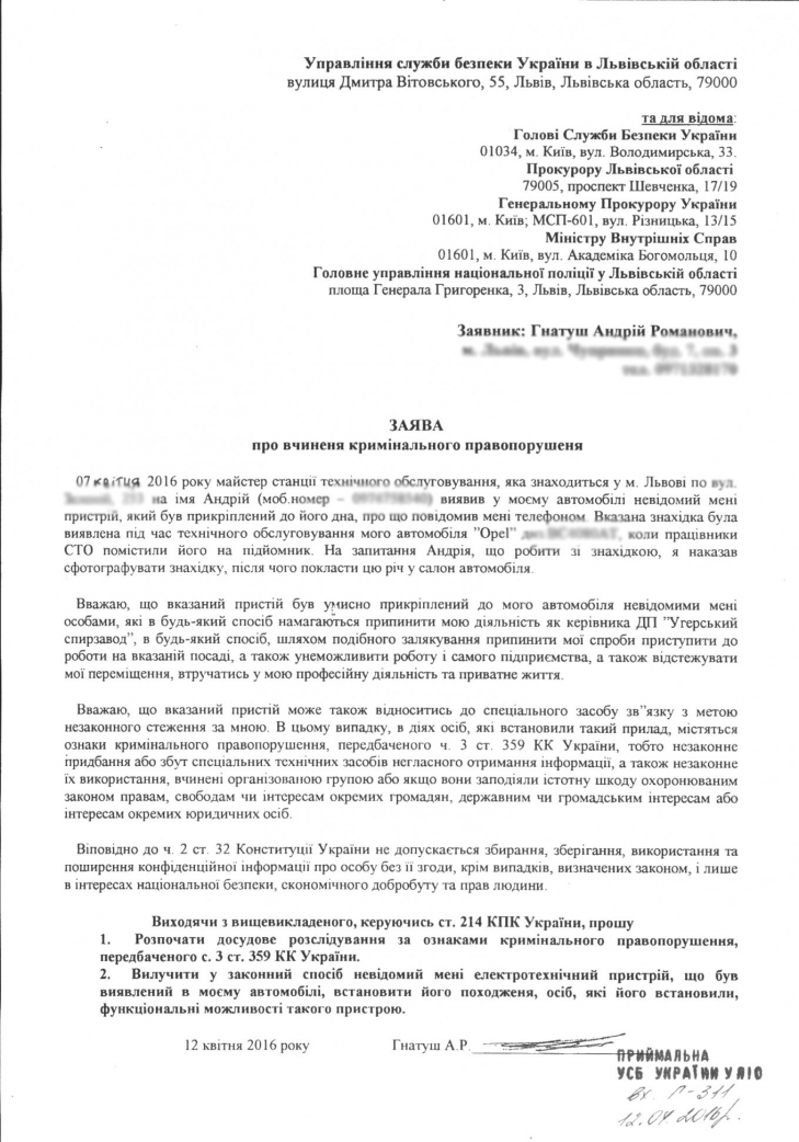 На данный момент Андрей Гнатуш передал прибор в СБУ вместе с заявлением, в котором просит Службу безопасности начать досудебное расследование по признакам правонарушения, предусмотренного ст. 359 УК Украины. «Считаю, что устройство было умышленно прикреплено к моему автомобилю неизвестными мне лицами, которые любыми способами пытаются прекратить мою деятельность в качестве руководителя ГП «Угерский спиртзавод», путем подобного запугивания, пытаются приостановить мои попытки приступить к работе на указанной должности, а также блокировать работу самого предприятия, отслеживая мое перемещение, вмешиваться в мою профессиональную деятельность и личную жизнь», - говорится в письме. – В соответствии с ч.2 ст. 32 Конституции Украины, не допускается сбор, хранение, использование и распространение конфиденциальной информации о лице без ее согласия, кроме случаев, определенных законом и только в интересах национальной безопасности, экономического благосостояния и прав человека».