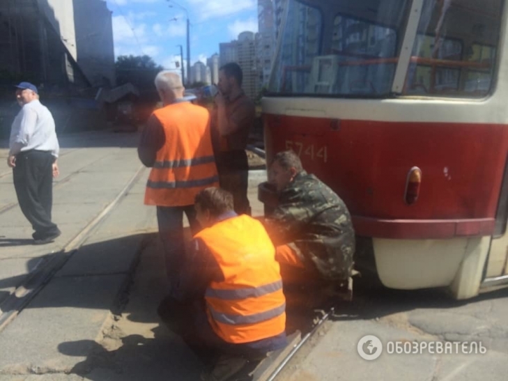 По состоянию на 16:10 на месте работали работники КП "Киевпасстранс", которые пытались поставить трамвай на место.