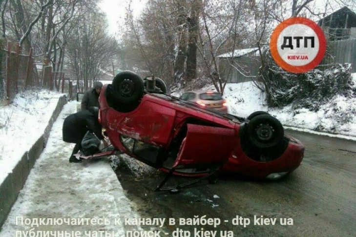 ДТП в Киеве: Автоледи перевернулась на легковушке, заехав на бордюр